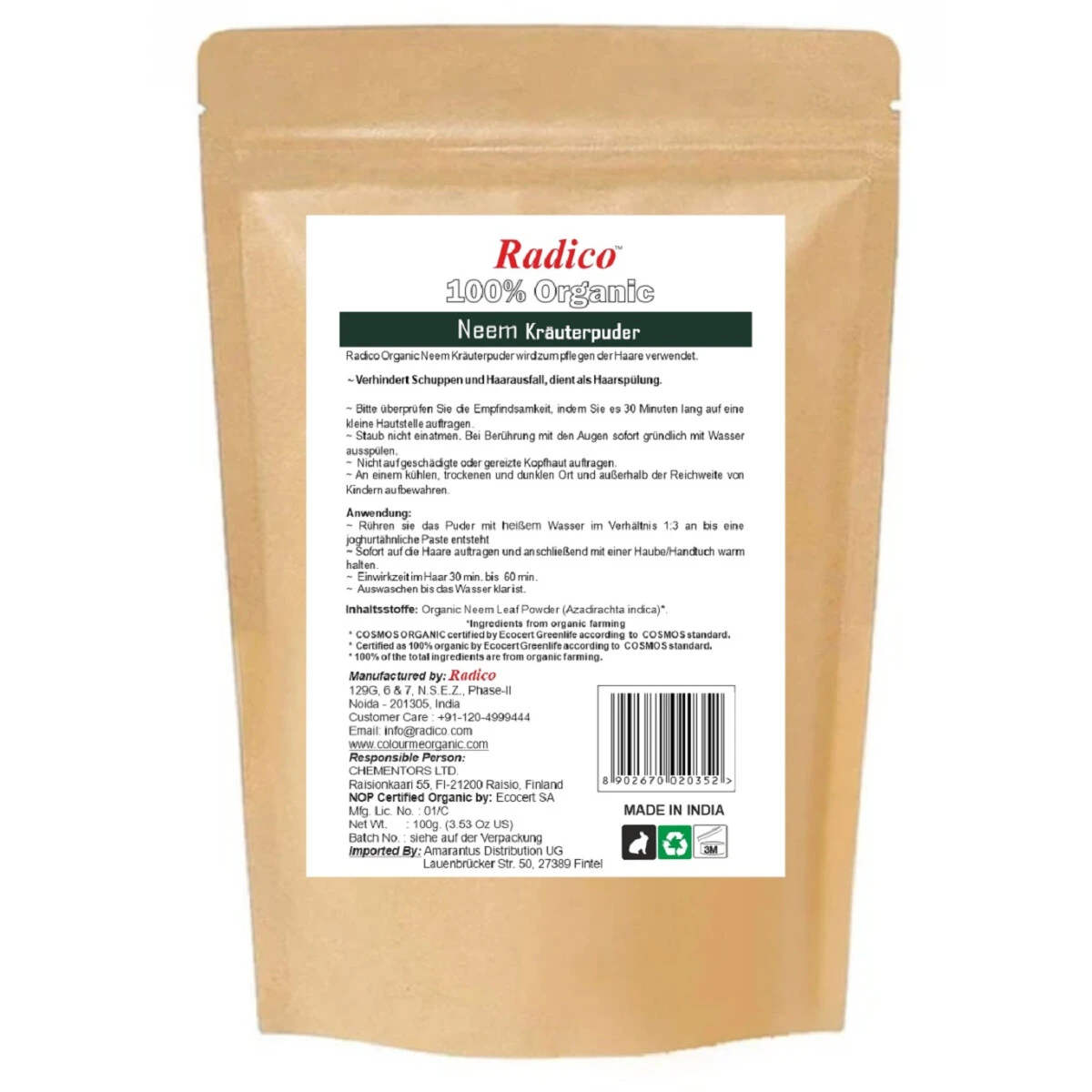 Der Organic Neem Powder von Radico ist zu 100% natürlichen Ursprungs und wird als Wash & Treatment für das Haar verwendet. Radico Haarpflege ist ideal für gesundheitsbewusst denkende Personen und für all diejenigen, die sensibel auf synthetische Inhaltsstoffe reagieren. Neem hat eine antibakterielle, und intensiv reinigende Eigenschaft. Es pflegt die Haare und bringt die Kopfhaut in Balance. Ihre Haare erhalten wieder mehr Glanz und fühlen sich kräftiger an.